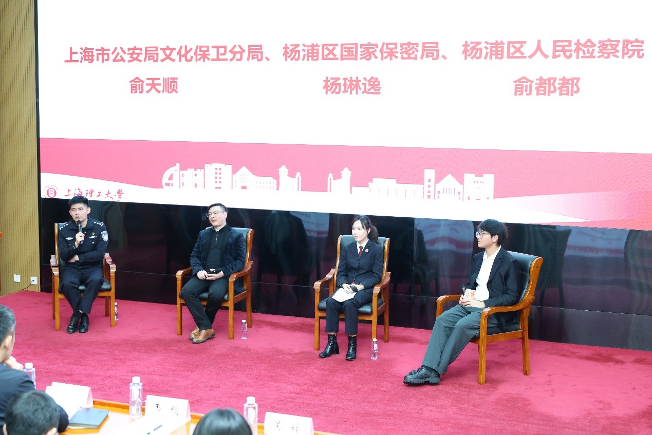 在“安全主题沙龙”环节,上海市公安局文化保卫分局治安支队四级警长俞天顺、杨浦区国家保密局四级调研员杨琳逸、杨浦区人民检察院第一检察部副主任俞都都,在机械工程学院团委书记曹森彬主持下,围绕“国家安全离我们有多远”展开对谈。三位专家分别从保密防线、法治护航、校园治安等角度,结合鲜活案例,深入浅出地阐释了政治安全、网络安全、经济安全、人工智能安全、数据安全等各领域的风险与应对策略。