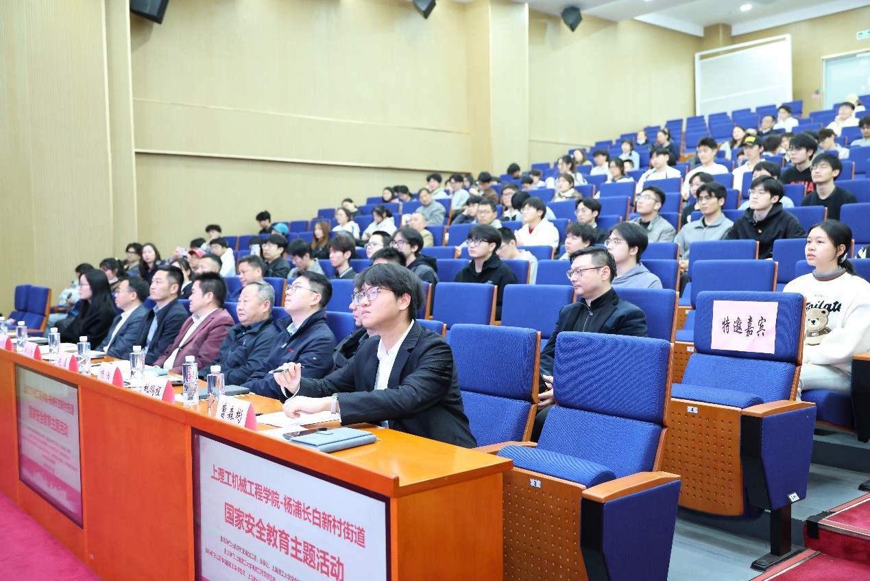 在第十一个全民国家安全教育日到来之际,4月14日下午,上海理工大学机械工程学院与杨浦区长白新村街道在国合楼三楼报告厅联合举办“统筹发展安全线,筑牢青春防火墙”全民国家安全教育日主题活动。活动通过政校联动、朋辈引领等形式,推动国家安全意识深入师生、扎根校园。杨浦区国家保密局、区人民检察院、市公安局文化保卫分局、区消防救援站、区反邪教协会等单位特邀嘉宾,长白新村街道办事处三级调研员胡仁勤及相关科室负责人,上海理工大学学生工作部(处)、保卫部(处)、校团委、机械工程学院相关负责人及师生代表共同参与活动。