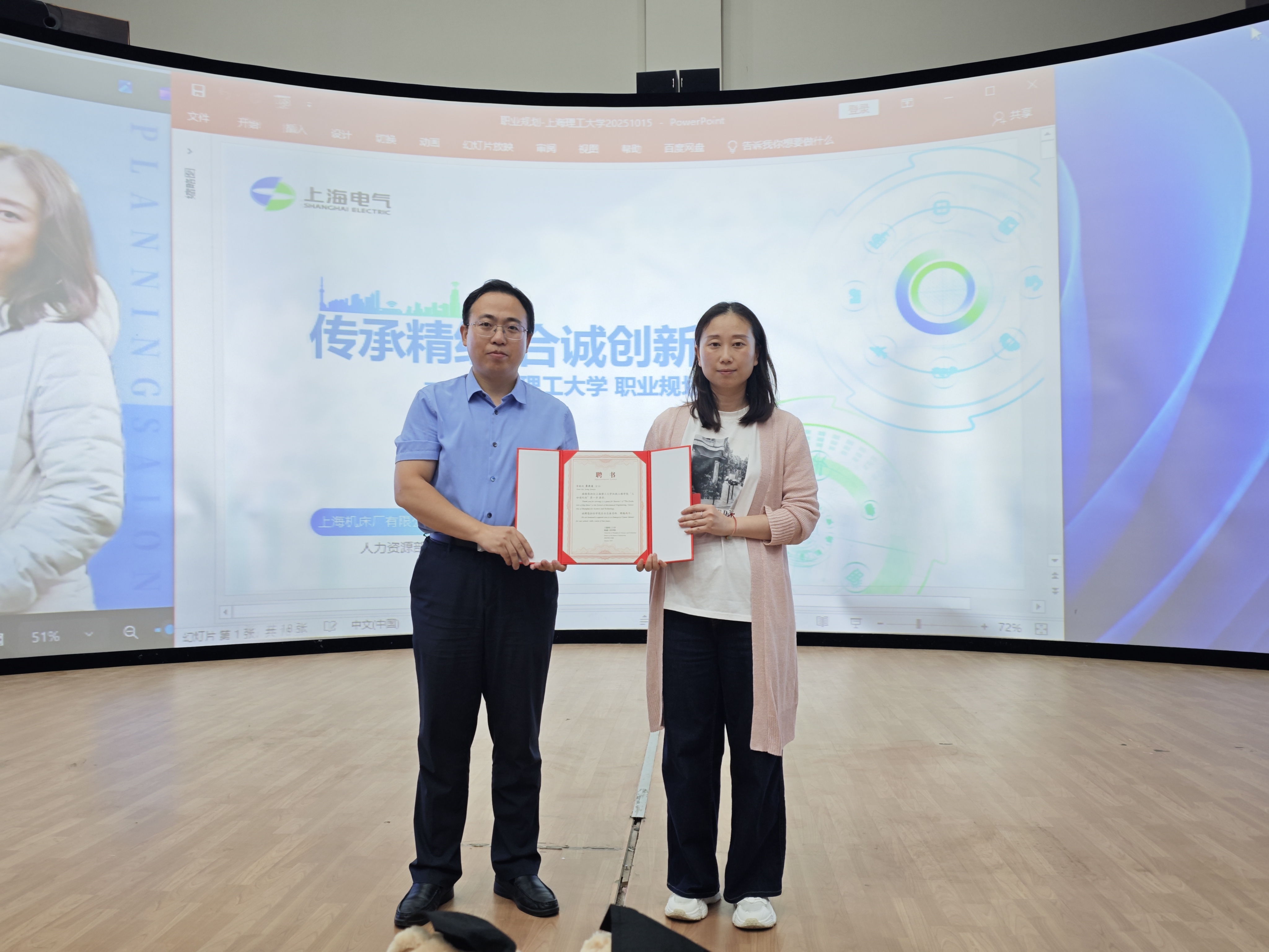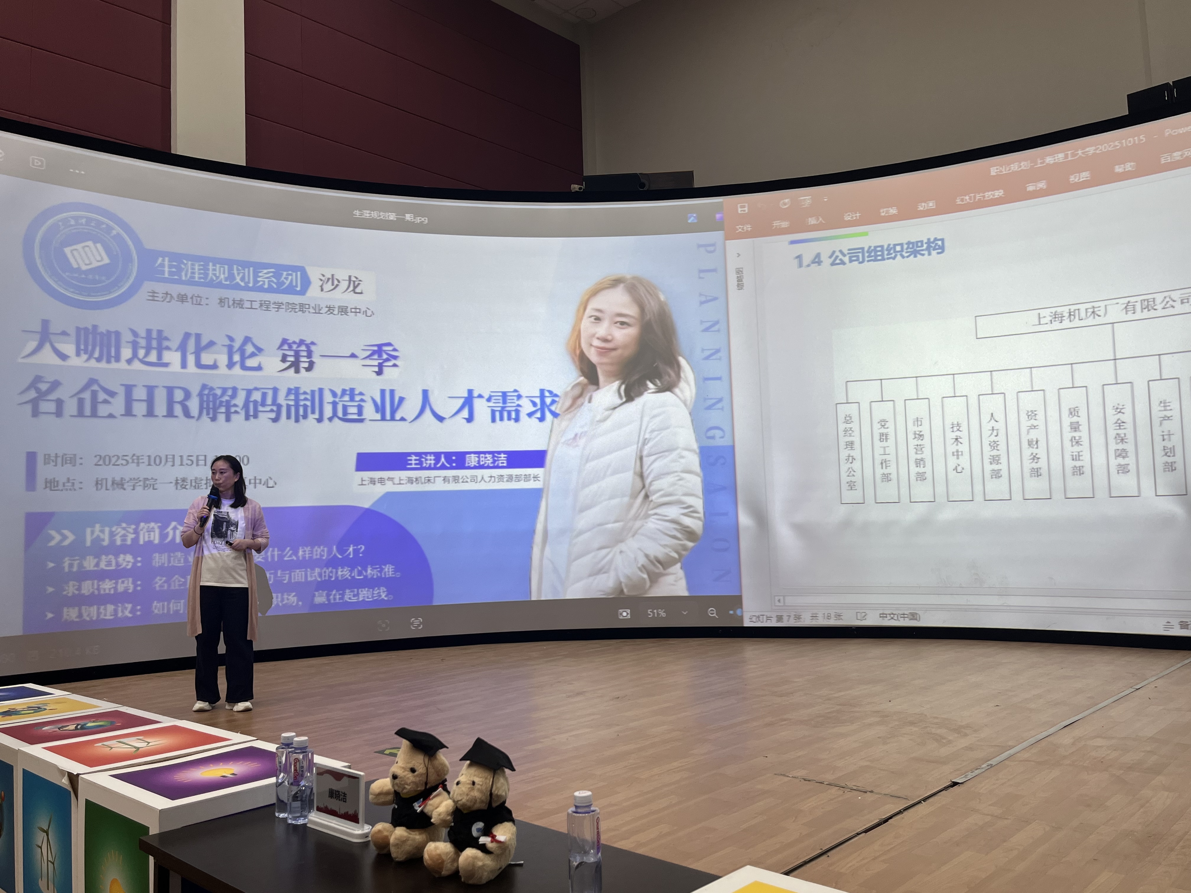 康晓洁聚焦于学生职业规划指导以“名企HR解码制造业人才需求”为主题,从三个维度展开分享。她介绍了上海电气机床厂有限公司的发展概况,包括企业的历史沿革、核心业务领域、行业地位及未来战略布局。通过展示企业在高端机床研发、智能制造解决方案等方面的成果,让学生们直观了解到机械行业的发展趋势与企业对人才的需求标准。在学生职业发展通道部分,康晓洁结合上海电气机床厂的人才培养体系,为在场学生梳理了从“校园人”到“企业人”的成长路径。康晓洁从企业人力资源招聘的实际经验出发,为学生提出了三点关键建议:一是夯实专业基础,打造核心竞争力,她建议学生在大学期间注重理论知识与实践能力的结合,积极参与科研项目、学科竞赛和企业实习,提升自身的技术水平与实操能力;二是明确职业目标,制定阶段性计划,她强调职业规划不是一成不变的,需要根据自身成长与行业变化动态调整,但大学期间应尽早明确大致方向,通过分阶段的目标实现逐步靠近理想职业;三是提升综合素养,适应企业需求,除专业能力外,沟通能力、团队协作能力、抗压能力等软技能同样重要,学生应通过社团活动、社会实践等途径全面提升自身素养。