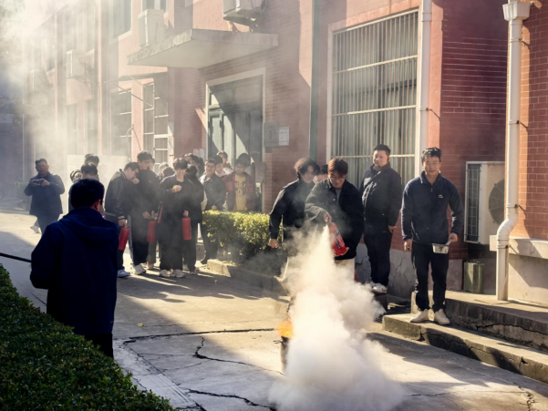 疏散完毕后,保卫处副处长赵磊发表讲话。他结合近期典型消防安全案例,深入浅出地讲解了火灾预防、初期火灾处置、火场逃生自救等核心知识,强调消防安全的重要性与紧迫性,呼吁全体师生时刻绷紧安全弦,将消防安全意识内化于心、外化于行。随后,保卫处工作人员现场演示灭火器“提、拔、握、压” 的正确使用方法,详细拆解操作要领,并针对火灾发生时的逃生误区进行重点提醒。为加深实操记忆,现场邀请师生代表亲自上手操作灭火器扑灭模拟火源,亲身感受灭火过程,切实提升应急处置能力。